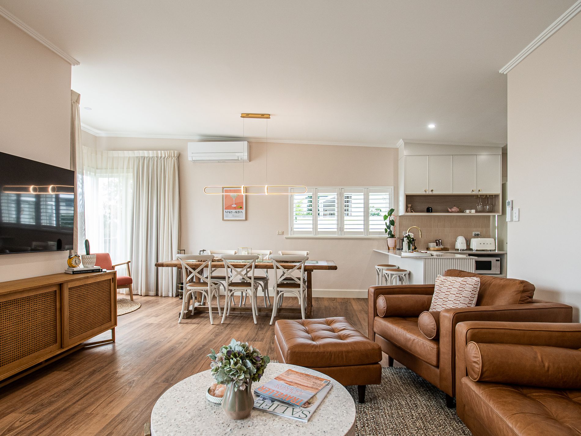 • Stunning open plan kitchen/dine and living with soft neutral tones, large north facing windows, split system heating/cooling unit