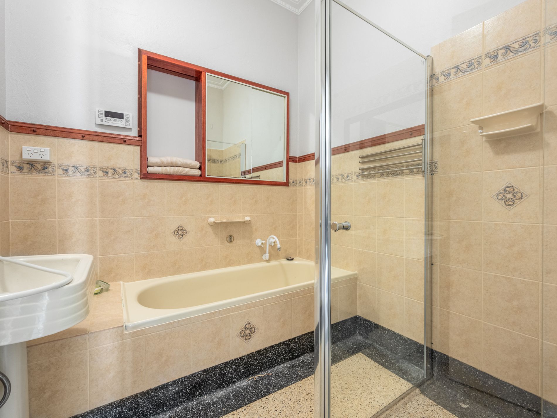 • Retro bathroom with pedestal basin and separate bath/shower