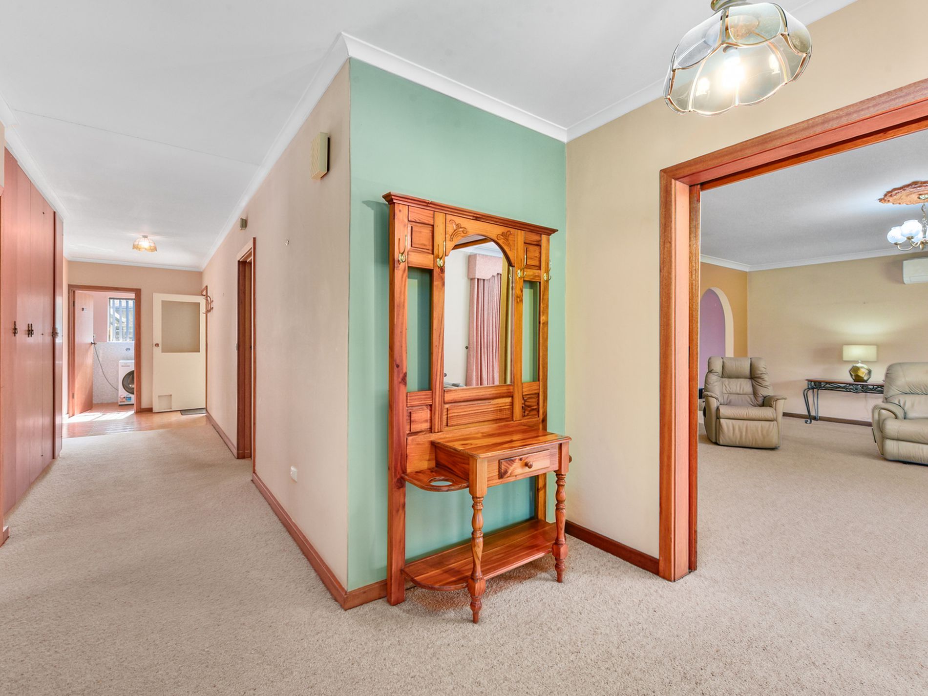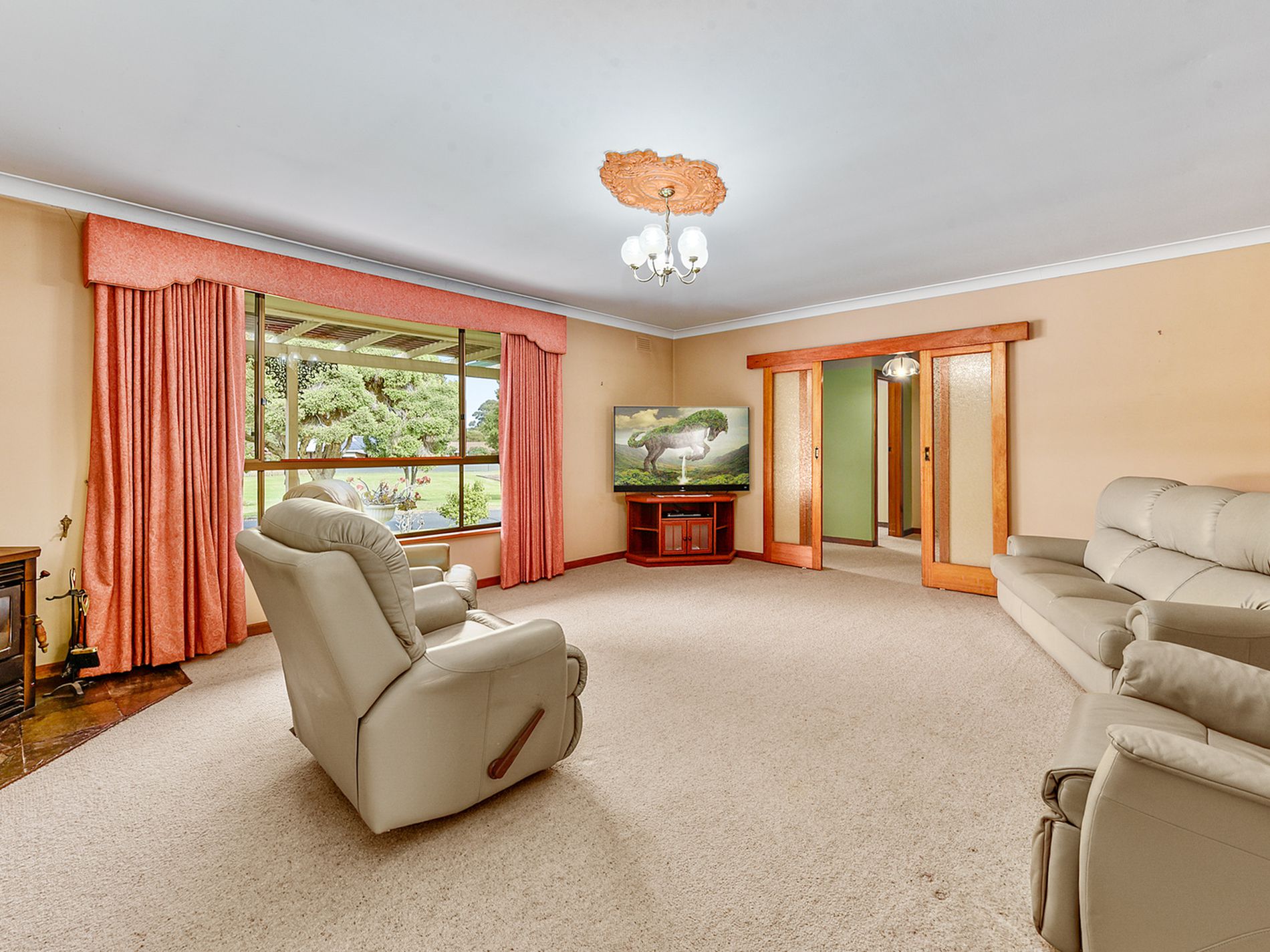 • Lounge room large enough for family gatherings with split system reverse cycle unit and slow combustion heating